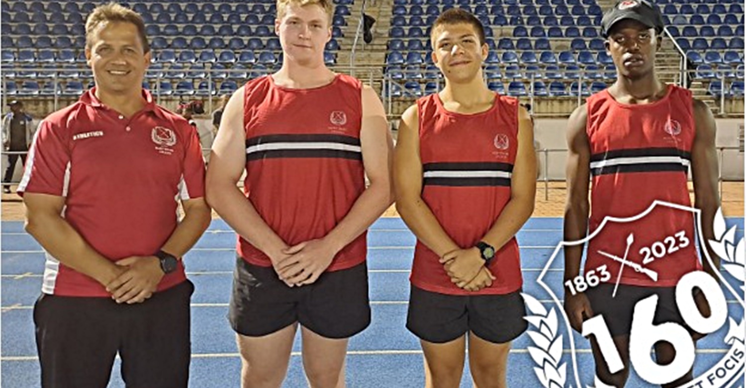 Master in charge of Athletics at Maritzburg College, Meiring Kritzinger, with Josh Sweetnam, Theo Boshoff and Yethaba Mchunu.